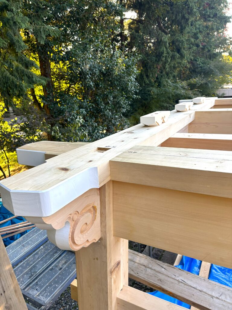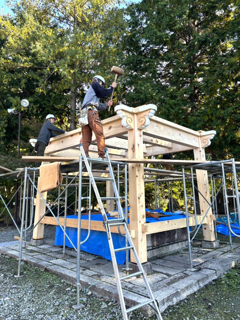 ようやく木鼻の彫刻が出来上がり、1層目の建て方が始まりました。