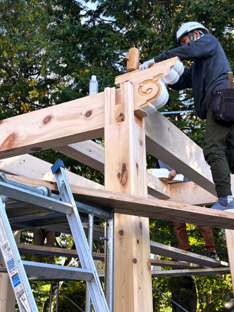 ようやく木鼻の彫刻が出来上がり、1層目の建て方が始まりました。